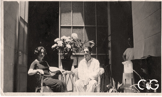 Izq.: Doña Pepa, madre de Armando, Dr. Baliñas, Doña Berta, Adela Blasco, Rosita Vacca y Armando Defino jugando con el perro en la casa de Jean Jaures 735. Der.: Adela Blasco y Armando Defino en la casa de Jean Jaures 735.