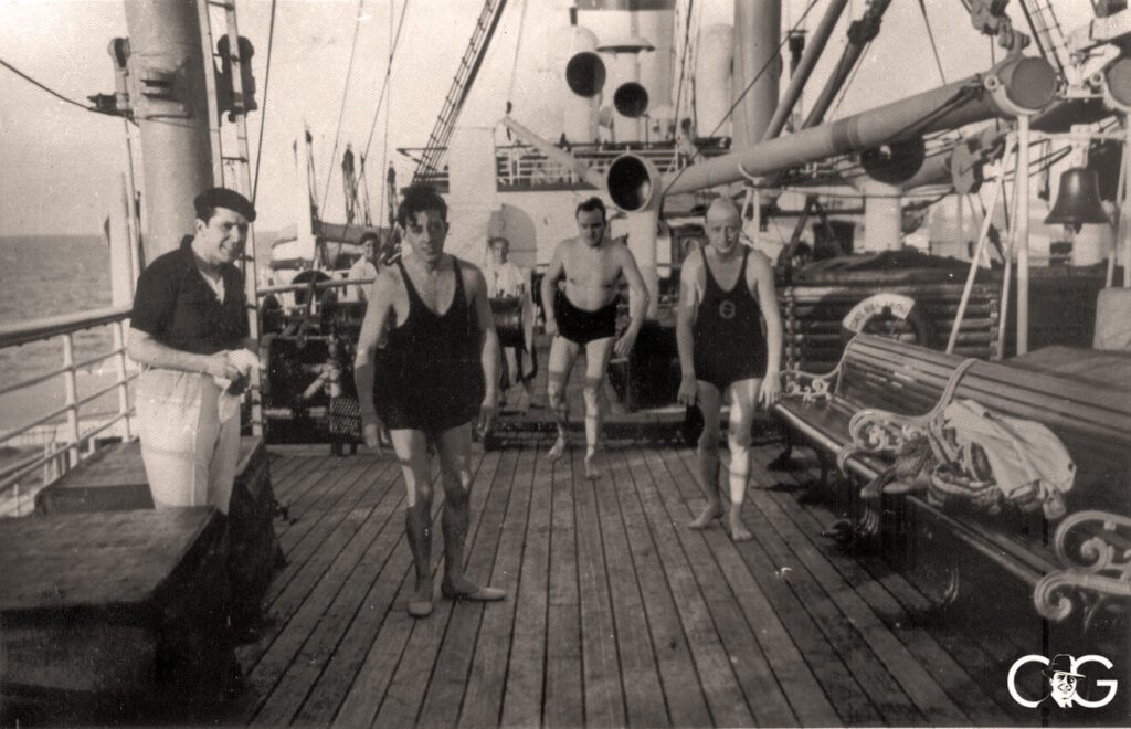 Carlos Gardel, Armando Defino, Horacio Pettorossi y Alberto Castellanos divirtiéndose en un viaje de Buenos Aires a Paris a bordo del Conte Biancamano, 7 de noviembre de 1933.
